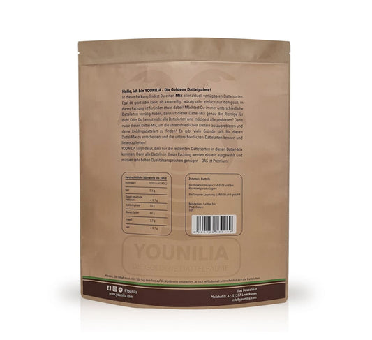 Unser Dattelmix wird mit größter Sorgfalt in aromageschützten plastikfreie Doypacks verpackt, um ihre Frische zu bewahren. Unser umweltfreundlicher Versandprozess stellt sicher, dass du nicht nur hochwertige Datteln erhältst, sondern auch die Umwelt geschont wird.