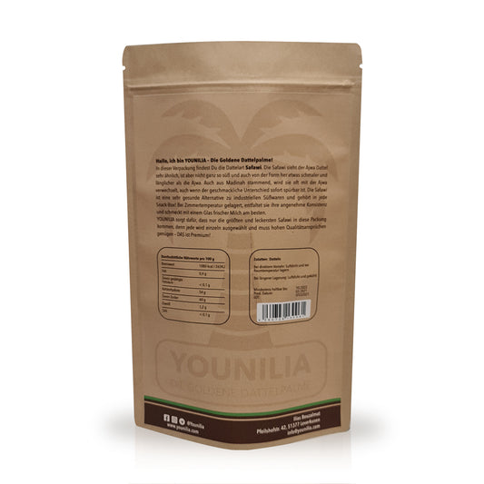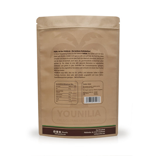Unsere Safawi wird mit größter Sorgfalt in aromageschützten plastikfreie Doypacks verpackt, um ihre Frische zu bewahren. Unser umweltfreundlicher Versandprozess stellt sicher, dass du nicht nur hochwertige Datteln erhältst, sondern auch die Umwelt geschont wird.