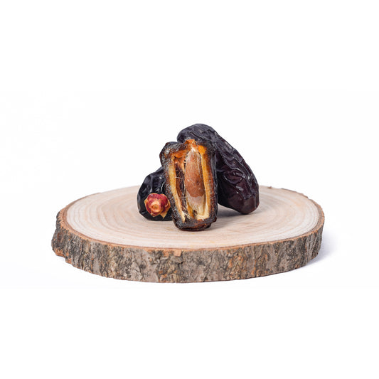 Die Safawi Datteln aus Medina sind sehr besondere Datteln. Die Kombination aus dunkler Farbe und länglicher Form hebt sie von anderen Dattelsorten ab. Das Beste an der Safawi-Dattel ist jedoch ihr köstlicher Geschmack – süß und aromatisch. In der arabischen Welt wird sie gerne mit einem Glas frischer Milch verzehrt. Eine unschlagbare Connection!