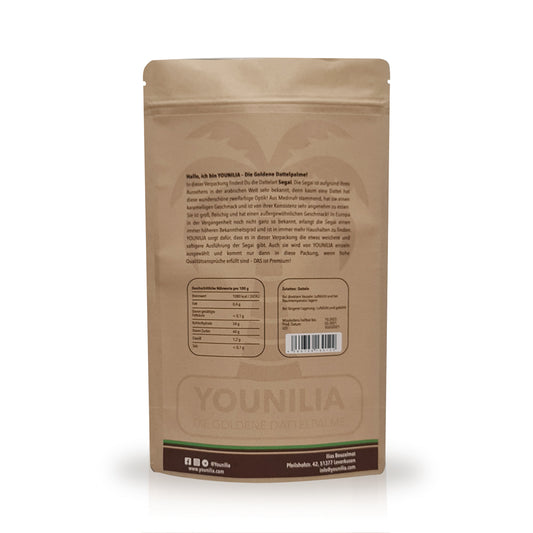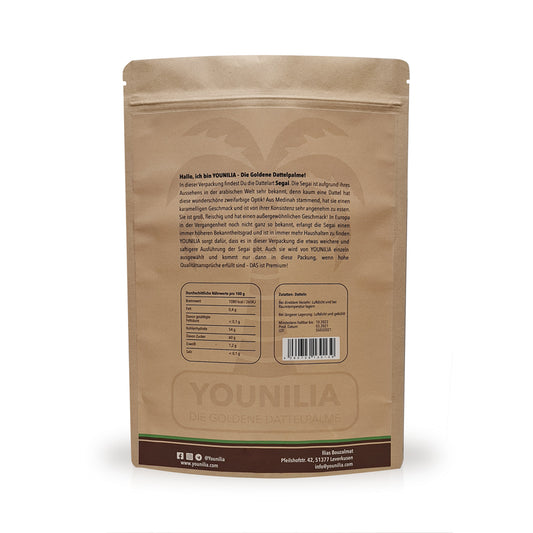 Bei der Ernte unserer Segai Datteln steht die Liebe zum Detail im Vordergrund. Unsere erfahrenen Bauern wählen für YOUNILIA sorgfältig nur die besten Datteln aus 1. Klasse heraus. Durch nachhaltige Anbaumethoden und eine unerschütterliche Hingabe zur Qualität garantieren wir Dir einen unvergleichlichen Genuss. Jede Segai Dattel wird erst geerntet, wenn sie ihren vollen Geschmack und ihre natürliche Süße erreicht hat. Wir von YOUNILIA erhalten nur die makellosesten Datteln jeder Ernte, weil wir nur das Beste unter dem Besten anbieten möchten.